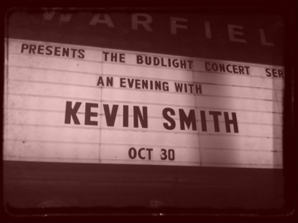 Kevin Smith did a Q&A at the Warfield in San Francisco on Friday night. It was hilarious (as his Q&As usually are). I heard a few stories I've heard before, whether it be from hearing it SModcast or something else. But I heard a lot of new stories that I hadn't ever heard before. One of those never-before-heard stories was actually the story I was most curious and intrigued about. That was the story of how he handled the box office performance of Zack & Miri Make A Porno after experts telling him that the movie SHOULD open big[but it didn't]. After making his R-rated comedies for 10 years, and never really passing that $30 million mark at the box office, he thought that was the ceiling for R-rated comedies. That's as high as the numbers will go for the type of movie. Until one day, Mr. Judd Apatow comes along and makes these R-rated comedies EXTREMELY profitable. Smith spoke on how he read in an article somewhere, "With the arrival of Judd Apatow, Kevin Smith has become irrelevant" and how that just ate at him. How he isn't ready to leave. He's not ready for this all to be over. So Smith saw Seth Rogen in The 40 Year-Old Virgin and immediately loved him. Started writing Zack & Miri with Rogen in mind. He got Rogen[one of Apatow's "boys"] signed on, the movie was testing well, experts were telling him how much this movie would make and how profittable it would be, Smith was excited. This was it. This was his "comeback" of sorts. His validity of relevance. And when it didn't do gangbusters at the box office, like he had hoped, that's when he realized, it was over. The way Smith spoke about the realization that he is no longer that same person who made Clerks, Chasing Amy... He's no longer an angry, young man. Over the course of his 15 years of filmmaking, he has become a better filmmaker[in regards to technique] but he has lost a little bit of that genuine fire and he is not in that place anymore where he can make HIS movies. Where does he go from here? What will Smith do now? Apatow has come along and made "Kevin Smith" movies better than Kevin Smith. It's now become a genre. The "bromantic comedy" and a new one comes out every other weekend. Just the self-realization and acceptance that Smith has was absolutely mind-blowing. It truly gave me chills. Almost brought a tear to my eye. I am not kidding. It was one of the most raw and insightful things I have ever heard and it was amazing.